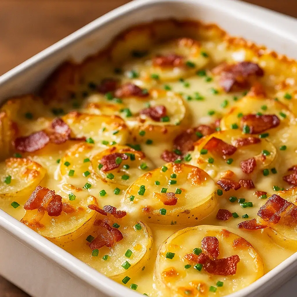 These loaded scalloped potatoes represent everything I love about creating food that brings people together because they take simple accessible ingredients and transform them into something that feels both familiar and special and the combination of tender potatoes rich cream sauce crispy bacon and melted cheese creates the kind of dish that makes ordinary meals feel like celebrations