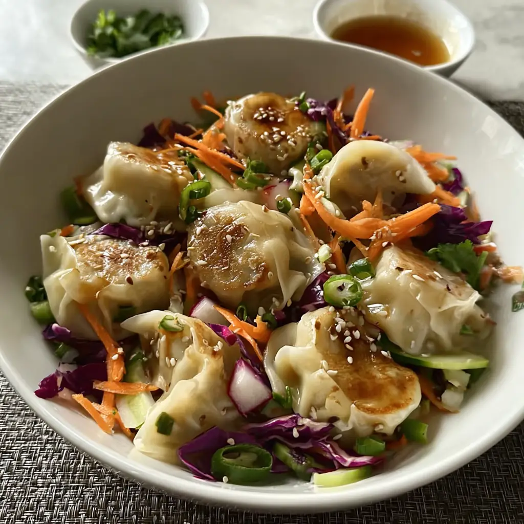 Step 5: Add Warm Dumplings and Final Assembly Arrange the warm, crispy dumplings on top of the dressed vegetables because the temperature contrast creates an appealing sensory experience while allowing diners to mix components according to personal preference. Drizzle remaining dressing over the dumplings and sprinkle with sliced green onions and chopped cilantro because these final additions provide color contrast and fresh aromatic elements that enhance appetite appeal.